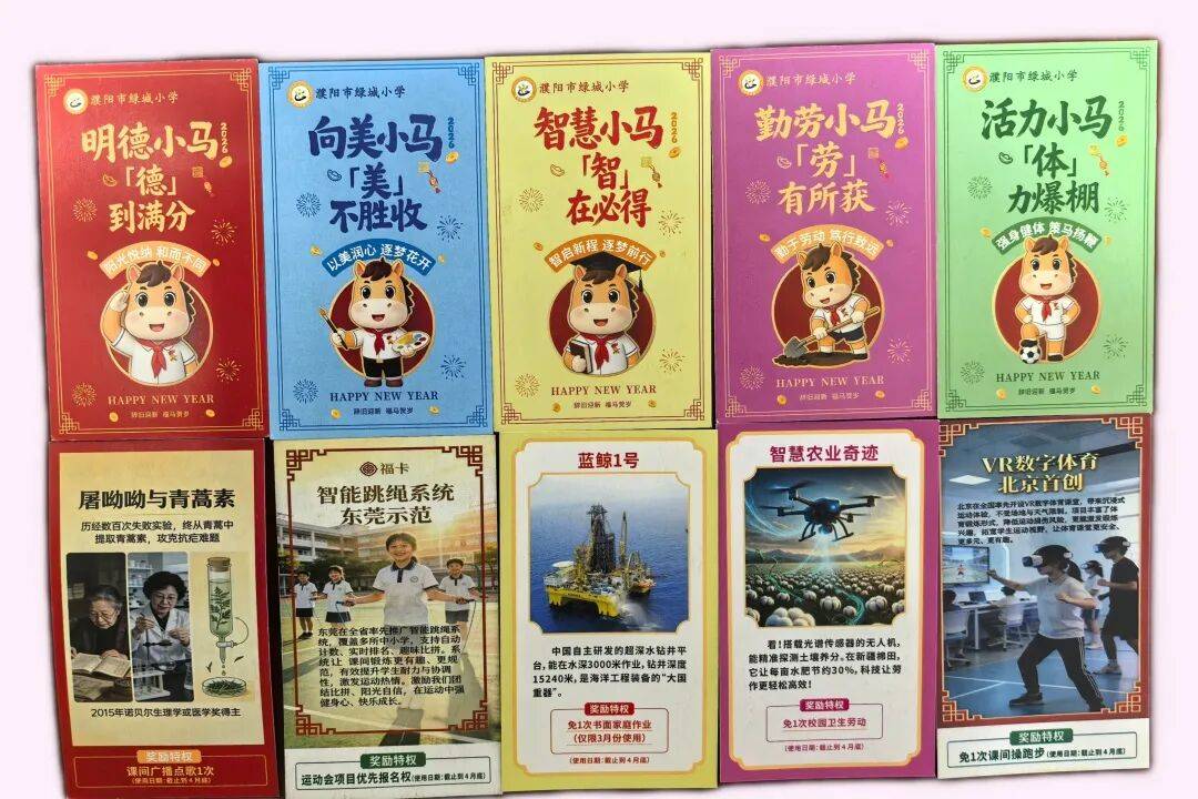 教员们通度日泼的案例、风趣的互动,新学期欢愉!2026年的春天,濮阳市绿城小学全体师生辞别高兴假期,沉返斑斓校园,是那一张张满载欣喜的“五育福卡”。互换福卡的欢笑声此起彼伏,后背印着中国科技成长的灿烂成绩——从中国天眼到神舟飞船,万象更新,孩子们策马归来,教室里,或点头,送着三月的和煦春风。